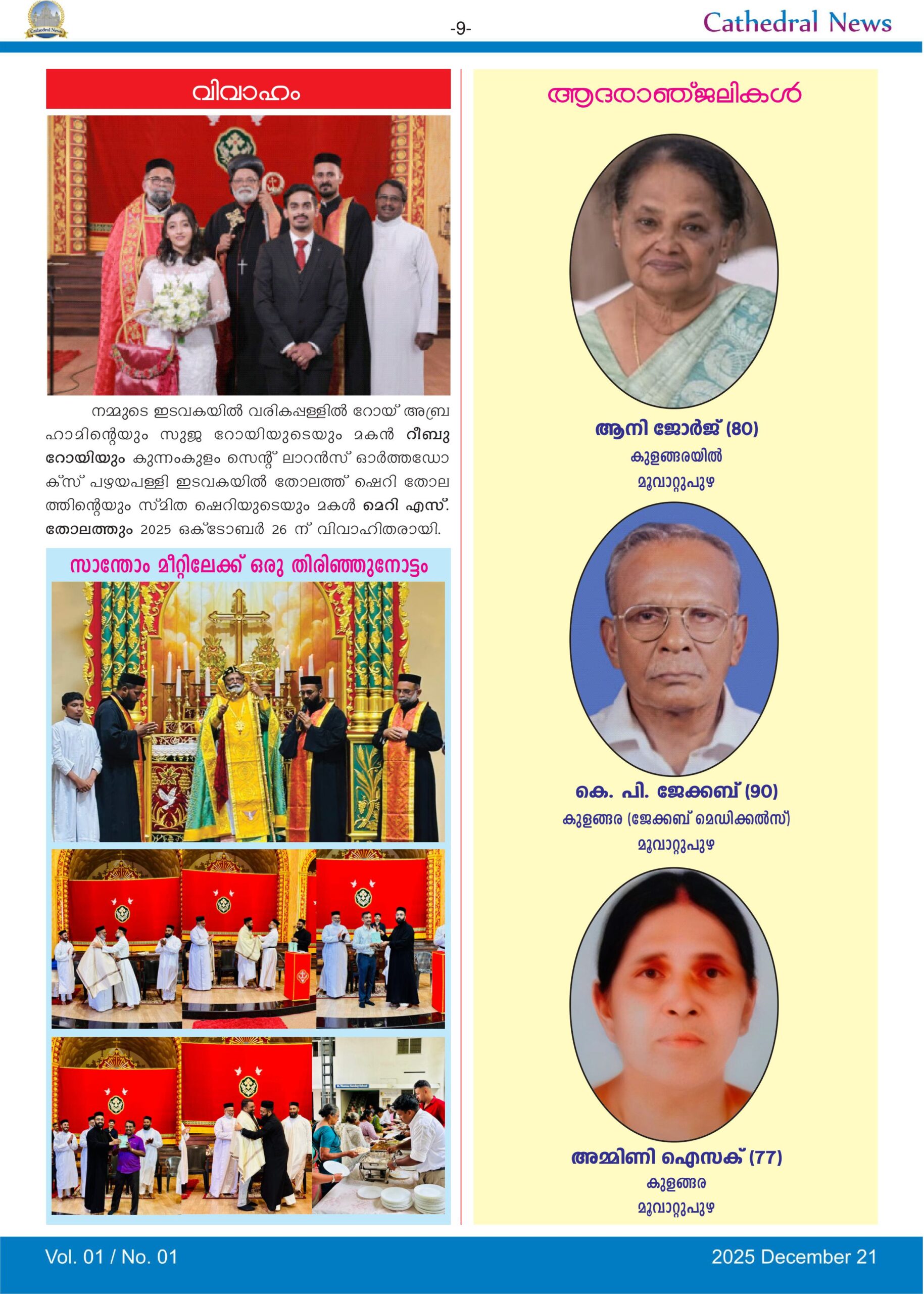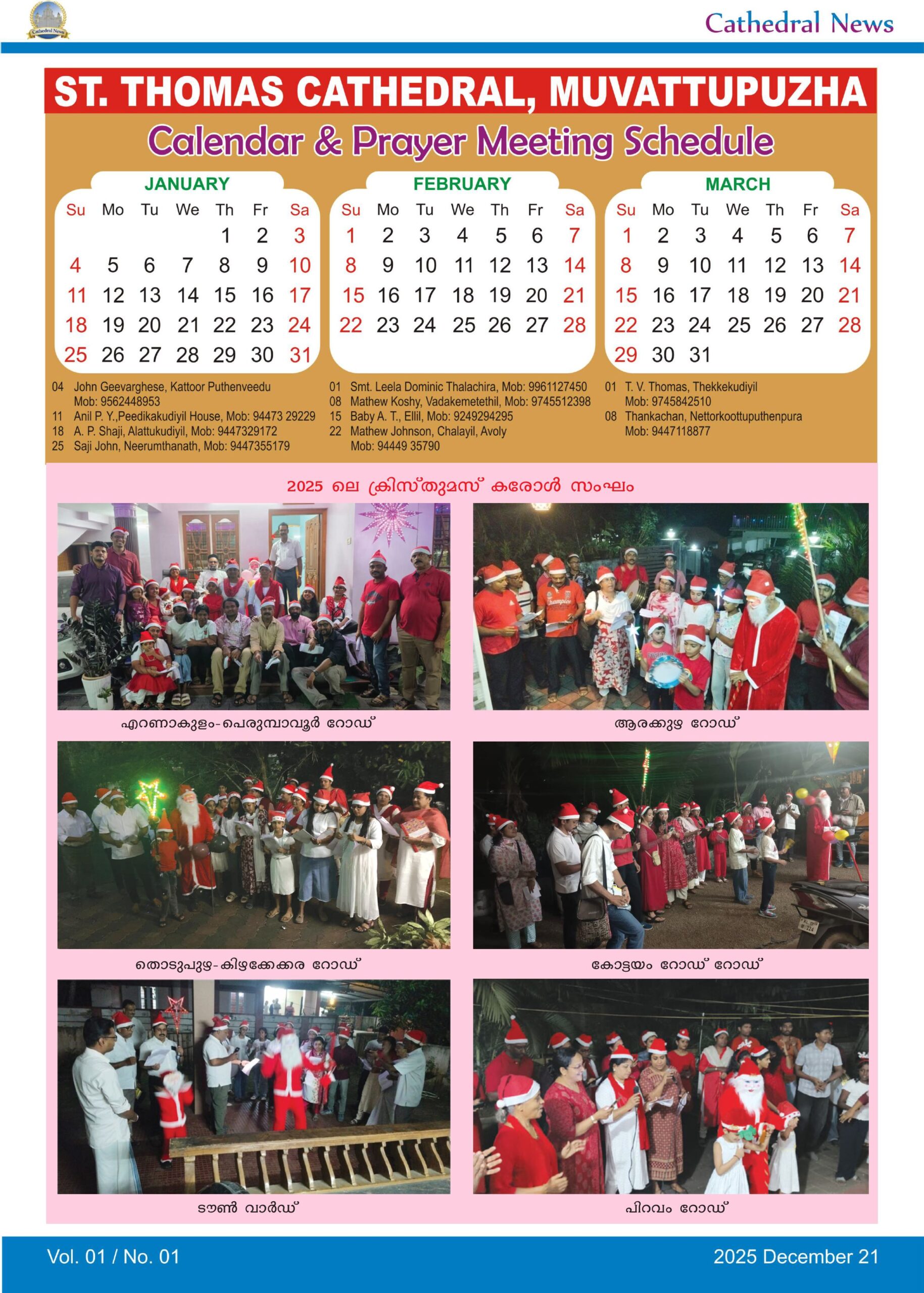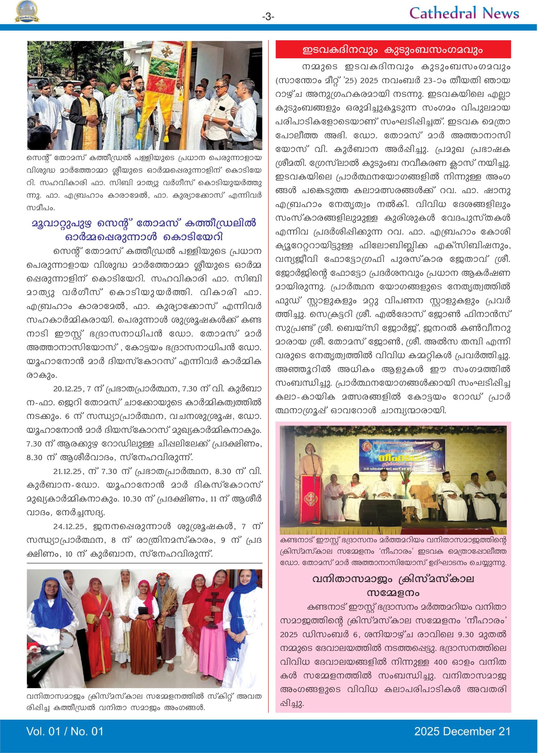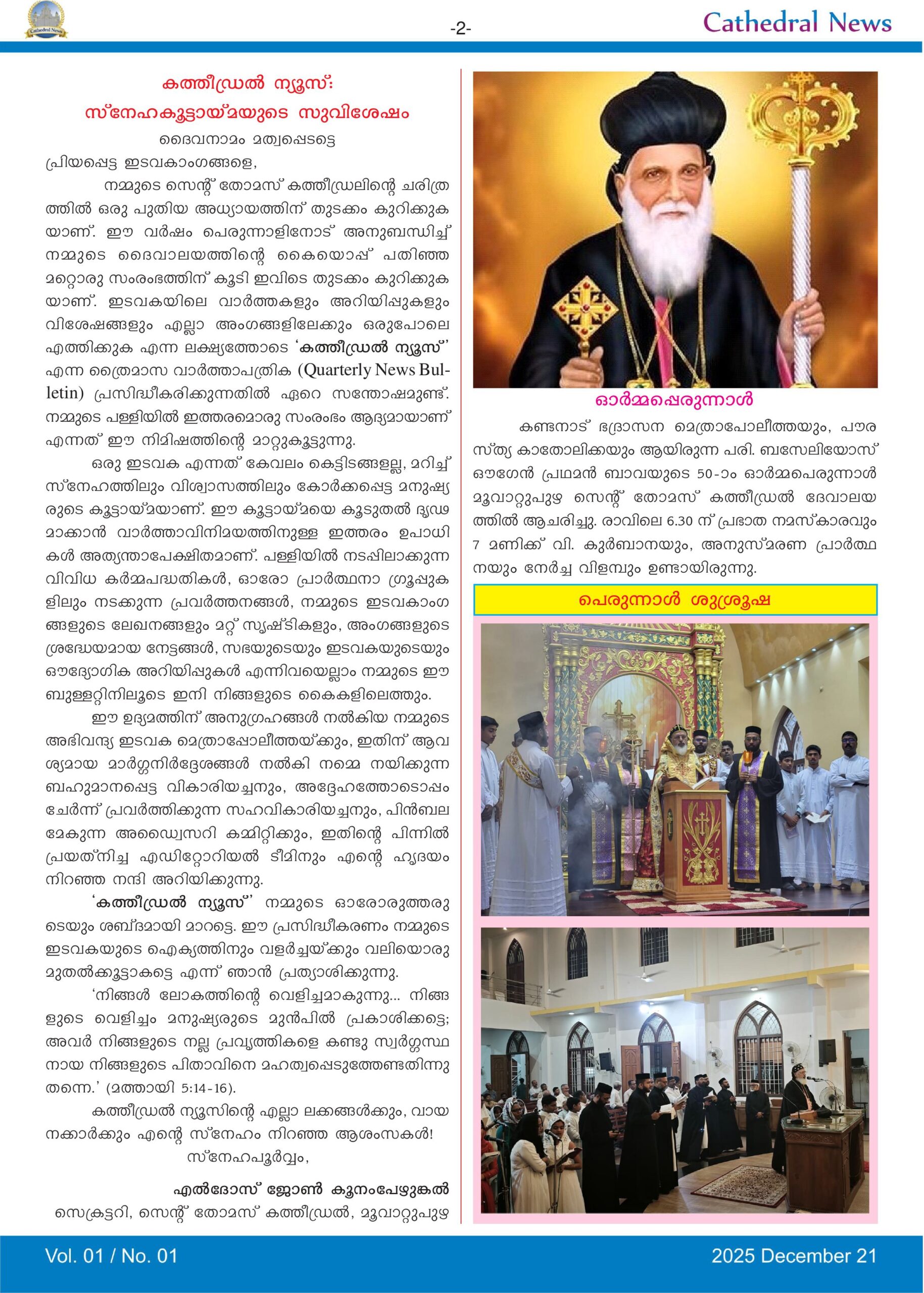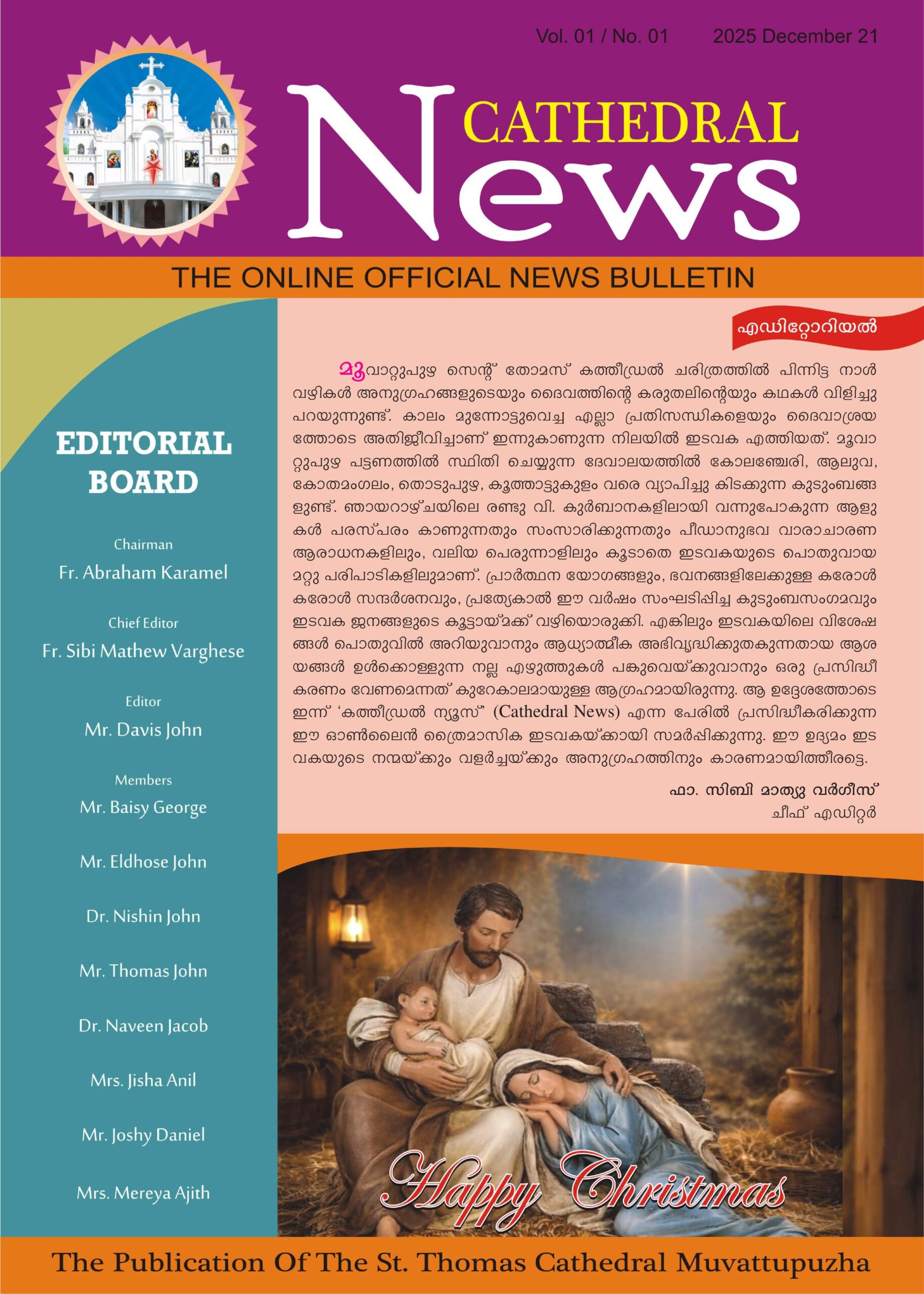 മൂവാറ്റുപുഴ സെൻ്റ് തോമസ് കത്തീഡ്രൽ ചരിത്രത്തിൽ പിന്നിട്ട നാൾവഴികൾ അനുഗ്രഹങ്ങളുടെയും ദൈവത്തിൻ്റെ കരുതലിൻ്റെയും കഥകൾ വിളിച്ചു പറയുന്നുണ്ട്. കാലം മുന്നോട്ടുവെച്ച എല്ലാ പ്രതിസന്ധികളെയും ദൈവാശ്രയത്തോടെ അതിജീവിച്ചാണ് ഇന്നുകാണുന്ന നിലയിൽ ഇടവക എത്തിയത്. മൂവാറ്റുപുഴ പട്ടണത്തിൽ സ്ഥിതി ചെയ്യുന്ന ദേവാലയത്തിൽ കോലഞ്ചേരി, ആലുവ, കോതമംഗലം, തൊടുപുഴ, കൂത്താട്ടുകുളം വരെ വ്യാപിച്ചു കിടക്കുന്ന കുടുംബങ്ങളുണ്ട്. ഞായറാഴ്‌ചയിലെ രണ്ടു വി. കുർബാനകളിലായി വന്നുപോകുന്ന ആളുകൾ പരസ്പ‌രം കാണുന്നതും സംസാരിക്കുന്നതും പീഡാനുഭവ വാരാചാരണ ആരാധനകളിലും, വലിയ പെരുന്നാളിലും കൂടാതെ ഇടവകയുടെ പൊതുവായ മറ്റു പരിപാടികളിലുമാണ്. പ്രാർത്ഥന യോഗങ്ങളും, ഭവനങ്ങളിലേക്കുള്ള കരോൾ കരോൾ സന്ദർശനവും, പ്രത്യേകാൽ ഈ വർഷം സംഘടിപ്പിച്ച കുടുംബസംഗമവും ഇടവക ജനങ്ങളുടെ കൂട്ടായ്‌മക്ക് വഴിയൊരുക്കി. എങ്കിലും ഇടവകയിലെ വിശേഷങ്ങൾ പൊതുവിൽ അറിയുവാനും ആധ്യാത്മിക അഭിവൃദ്ധിക്കുതകുന്നതായ ആശയങ്ങൾ ഉൾക്കൊള്ളുന്ന നല്ല എഴുത്തുകൾ പങ്കുവെയ്ക്കുവാനും ഒരു പ്രസിദ്ധീകരണം വേണമെന്നത് കുറേകാലമായുള്ള ആഗ്രഹമായിരുന്നു. ആ ഉദ്ദേശത്തോടെ ഇന്ന് ‘കത്തീഡ്രൽ ന്യൂസ്’ (Cathedral News) എന്ന പേരിൽ പ്രസിദ്ധീകരിക്കുന്ന ഈ ഓൺലൈൻ ത്രൈമാസിക ഇടവകയ്ക്കായി സമർപ്പിക്കുന്നു. ഈ ഉദ്യമം ഇടവകയുടെ നന്മയ്ക്കും വളർച്ചയ്ക്കും അനുഗ്രഹത്തിനും കാരണമായിത്തീരട്ടെ.
