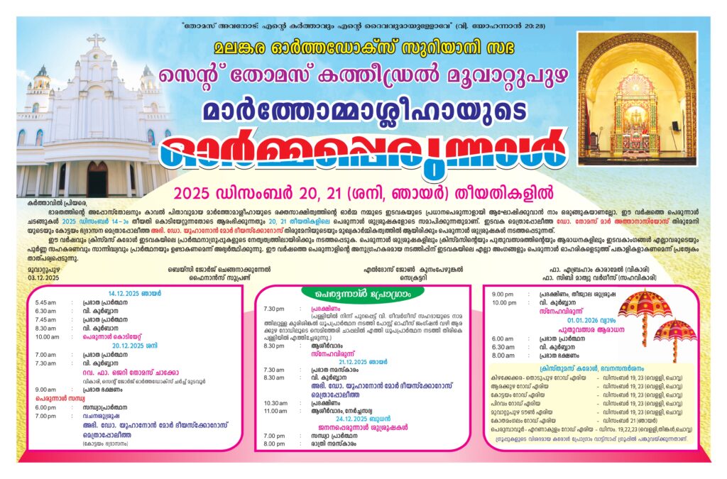 കർത്താവിൽ പ്രിയരെഭാരതത്തിന്റെ അപ്പോസ്തോലനും കാവൽ പിതാവുമായ മാർത്തോമാശ്ലീഹായുടെ രക്തസാക്ഷിത്വത്തിൻ്റെ ഓർമ്മ നമ്മുടെ ഇടവകയുടെ പ്രധാനപെരുന്നാളായി ആഘോഷിക്കുവാൻ നാം ഒരുങ്ങുകയാണല്ലോ. ഈ വർഷത്തെ പെരുന്നാൾ ചടങ്ങുകൾ 2025 ഡിസംബർ…